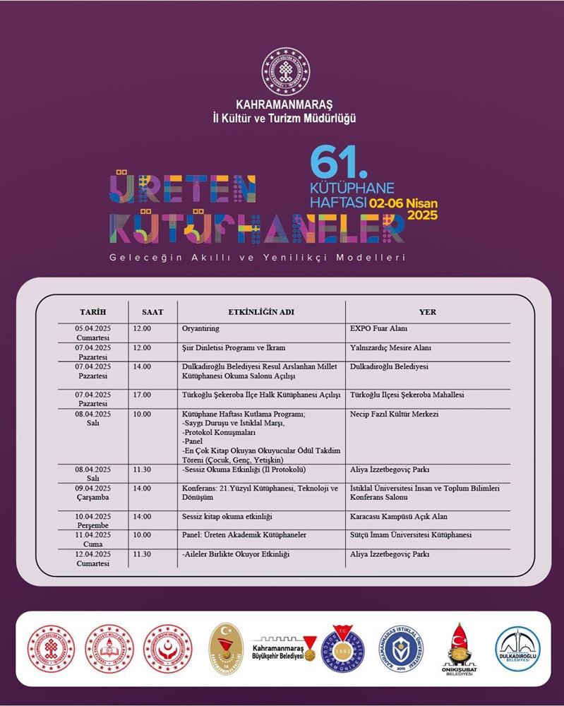 Ülke genelinde “üreten kütüphaneler” ana teması ile kutlanan 61. Kütüphaneler Haftası Kahramanmaraş’ta da İl Kültür ve Turizm Müdürlüğü koordinasyonunda çeşitli etkinliklerle kutlanılmaya devam etmektedir. Bu kapsamda Expo fuar alanında oryantiring, Yalnızardıç Mesire Alanı'nda Şiir Dinletisi, Türkoğlu Şekaroba İlçe Halk Kütüphanesi açılışı Dulkadiroğlu Belediyesi Resul Arslanhan Millet Kütüphanesi açılışı, Necip Fazıl Kısakürek Kültür Merkezinde Kütüphane Haftası Kutlama Programı ve Aliye İzzet Begoviç Parkı’nda Sessiz Okuma Etkinliği gerçekleştirilmiş olup kutlamalara 21.Yüzyıl Kütüphanesi Teknoloji ve Dönüşüm Konferansı, Üreten Akademik Kütüphaneler Paneli, sessiz kitap okuma etkinlikleri ile devam edilecektir.